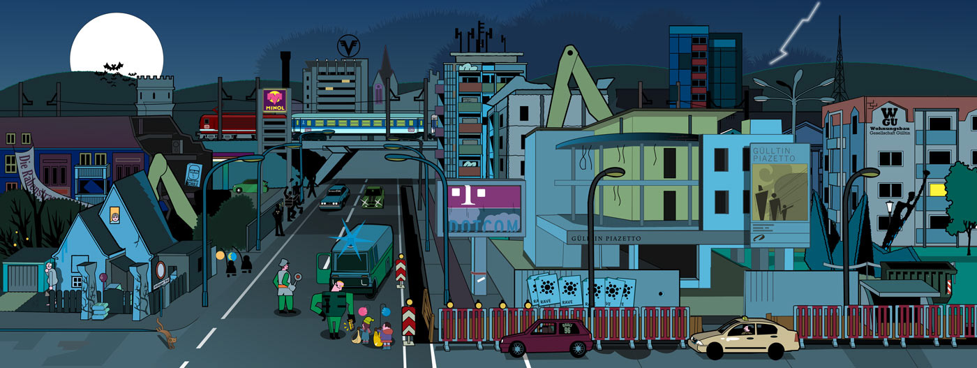 A project I did a long while ago. It shows the changes a fictional town in east Germany goes through over the decades. The tale startfs briefly after the war, goes through the Sputnik-era and the reunification and ends in the 21st century. It shows the typical process of first rapid growth after the war - only to loose alot of inhibitants after the reunification. I personally grew up in west Germany, so this view on an eastern town is heavily biased and historically not correct. It references also cliches and projections of how the west sees east Germany. I would love to continue it over the time. Search game: Can you find Zangief? :D