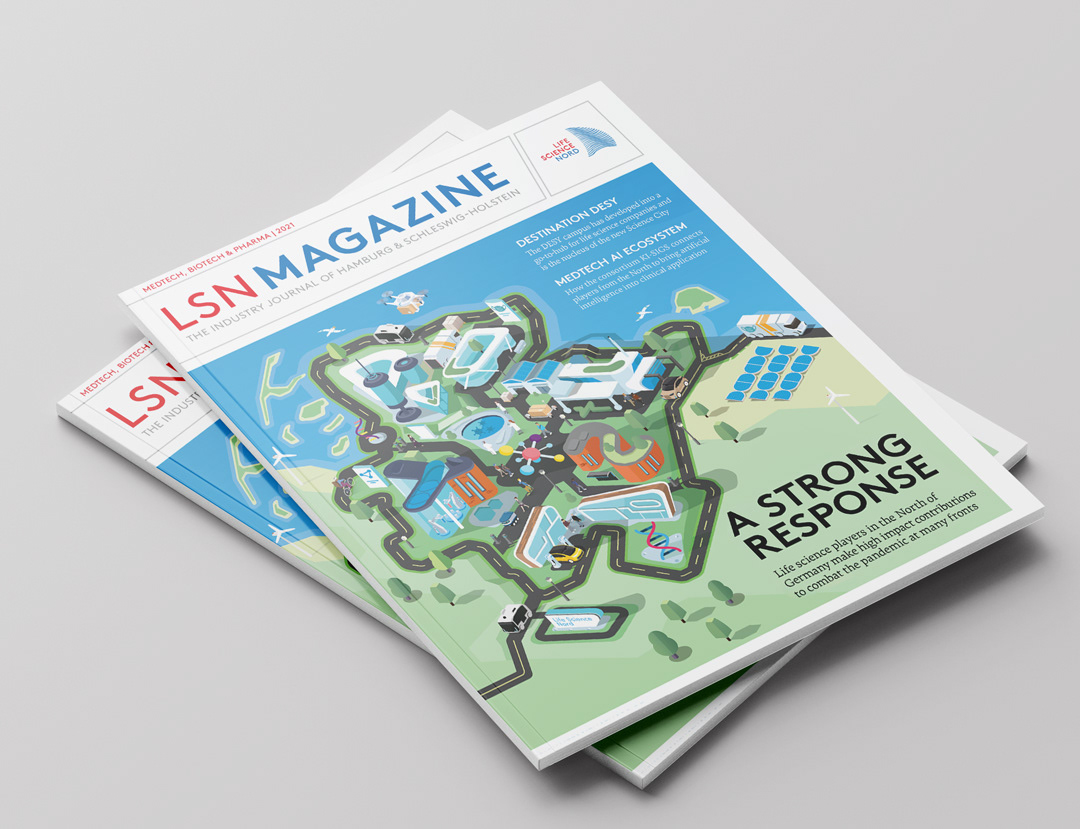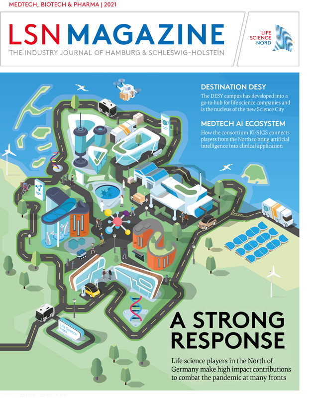 Illustration in the shape of the state Schleswig-Holstein. Cover for "LSN Magazine", published by Life Science Nord.